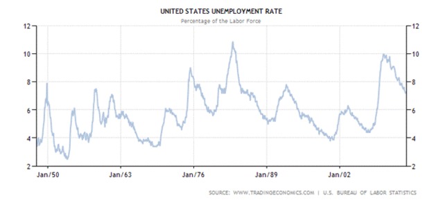 下面一张图就可以清楚地表现出美国的经济周期所在位置。美国的经济周期衡量标准不是GDP而是失业率。经济周期和失业率是完全相反的走势。从下图我们可以看出美国经济周期性非常强。上次失业率在2009年末达到最高点10%。那时候也是美国经济的底部。从那时至今接近4年,美国的失业率逐渐下降到了7.3%,但是在历史上仍然处于较高水平。所以美联储仍会保持零利率的货币政策相当长一段时间。原先美联储一直坚持会保持零利率直到失业率下降到6.5%以下。但是包括上周的美联储议息会议纪要和近期伯南克讲话,美联储很有可能会保持零利率直到失业率下降到6%以下。从失业率下降的速率来看,这个时间点很有可能会是在2015年底。在此之前,美国经济转向的可能性非常非常小。查看原图